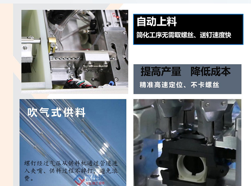 該鎖付系統可等同為全自動鎖螺絲流水線,通過四個工作站的作業,將百葉窗扇葉通過螺絲緊固在框架內的指定位置,螺絲采用自主研發吹氣式自動送釘機,直接輸送至鎖付機構;扇葉通過專用治具與框架定位,需手動放置;鎖付系統采用水平雙方向同時作業,配置4把電批位于兩側,一次擰好4顆螺絲;移動式作業臺根據程序設定,逐點向前推進并自動擰螺絲。